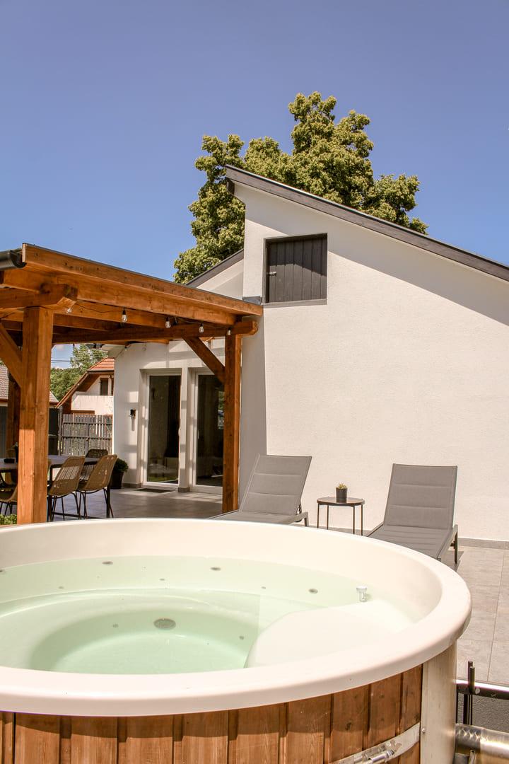 A ház kapuján belépve egy zöld udvaron keresztül jutsz el a Kisházba. A bejárat egy tágas teraszról nyílik, ahol egy fatüzelésű jakuzzi és egy finn szauna nyújt extra kényeztetést. Amint a házba lépsz egy amerikai konyhás nappali fogad, amelyből közvetlenül nyílnak a hálószobák és a fürdőszoba is.